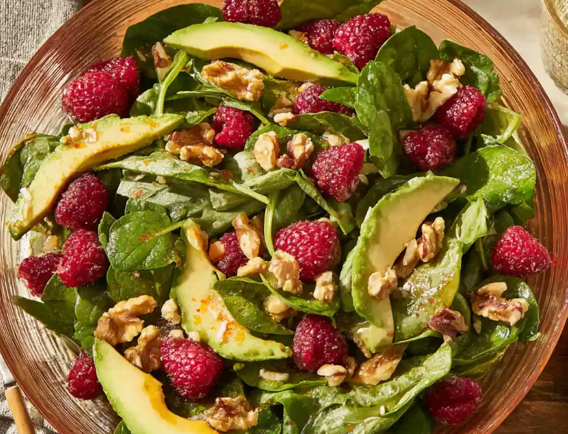 This salad is light, fresh, and nutrient-dense. Spinach provides fiber, iron, and vitamins A and C, while raspberries add antioxidants and natural sweetness. Healthy fats from avocado and walnuts help keep you satisfied without weighing you down.